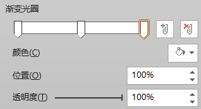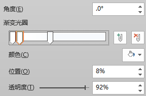 3、将矩形设置为渐变填充,渐变角度为0°。使用三个渐变光圈游标,均为白色,位置分别位于0%、50%、100%,且右端100%位置的光圈透明度为100%,设置如下图所示。