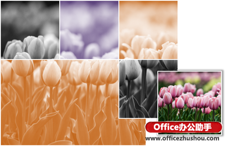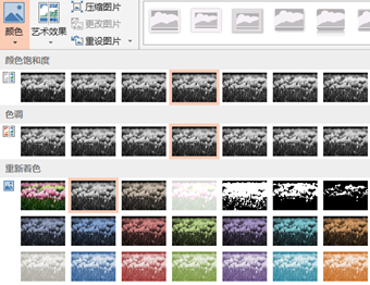 5、选中不同的矩形(已填充好图片的),进入“图片工具-格式”菜单,使用“颜色-重新着色”将图片重新着色处理。