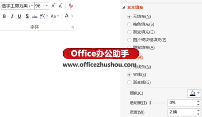 字体颜色为无填充(或和背景色相同),字体轮廓颜色为黑色,粗细为2磅。