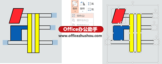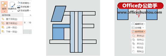 2、将文本框置入底层,构思字体色块组成:插入形状构成字体一部分,形状组成以矩形、菱形或梯形为主,“合并形状”组成多边形为辅,为尽量贴合字体轮廓还可以对形状再进行“顶点编辑”微调。