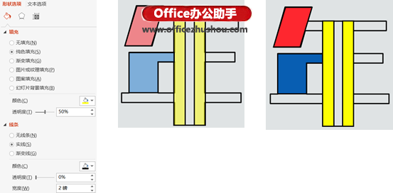 3、填充形状颜色和轮廓(和字体轮廓颜色粗细相同)。小技巧:为了方便查看各形状与字体的关系,可以先提高各形状填充色的透明度。