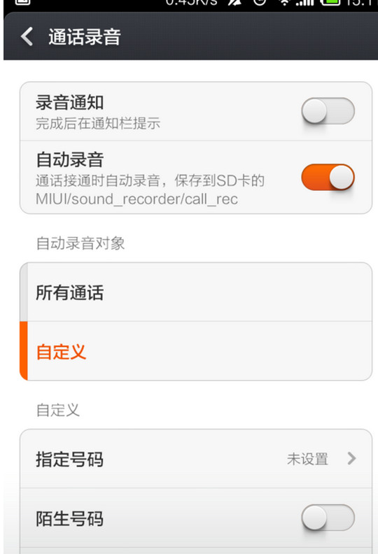 如只想对部分通话录音,可选择“自定义”选项,可以看到,下边多出了“指定号码”“陌生号码”“黄页号码”,用户可以根据自己需要自行设置。