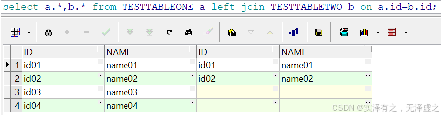 左表(a表)返回全部4条数据,右表(b表)只返回了id01和id02,对于左表存在而右表不存在的id03和id04两条数据,左表返回全部数据,而右表则返回NULL。