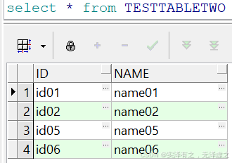 以oracle数据库为例,现在有两张表TESTTABLEONE(简称a表)和TESTTABLETWO(简称b表),两张表分别有id和name两个字段,两张表数据如下两图所示。