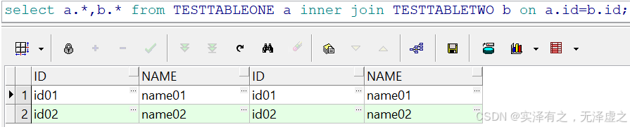 selecta.*,b.*fromTESTTABLEONE a,TESTTABLETWO bwherea.id=b.id;