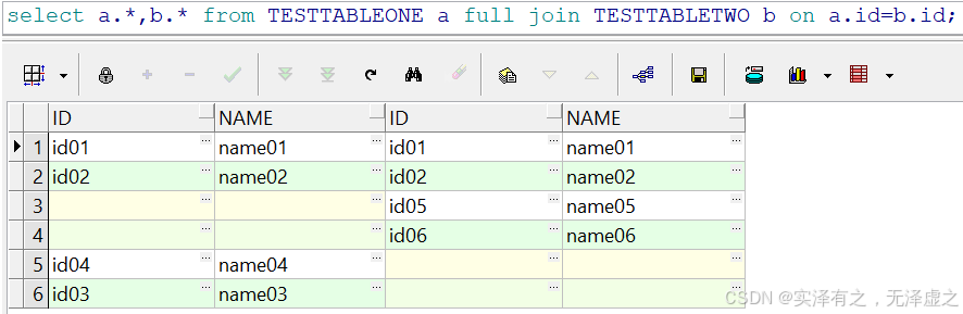 左表和右表都返回全部4条数据,对于左表存在而右表不存在的id03和id04两条数据,右表则返回NULL,对于右表存在而左表不存在的id05和id06两条数据,左表则返回NULL。