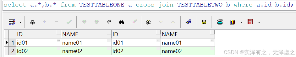 selecta.*,b.*fromTESTTABLEONE acrossjoinTESTTABLETWO bwherea.id=b.id;