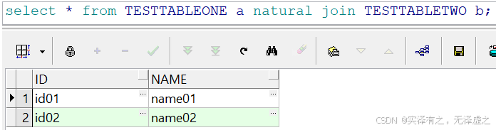 只返回左表和右表都存在的数据,并且,作为自然连接条件的ID和NAME字段没有重复显示。