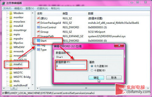 依次展开HKEY_LOCAL_MACHINESystemCurrentControlSetServicesMsahci项目,双击右边窗口的“Start”名称,看到“数据数值”默认为“3”,将其改为“0”后,点击“确定”按钮退出(图2)。