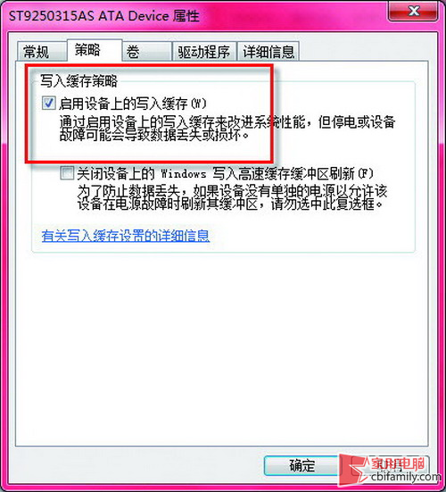 方法是进入设备管理器,展开“磁盘驱动器”,右键单击硬盘标志,并选择“属性”(图5),切换到“策略”窗口,勾寻启用设备上的写入缓存”(图6),然后点“确定”按钮。