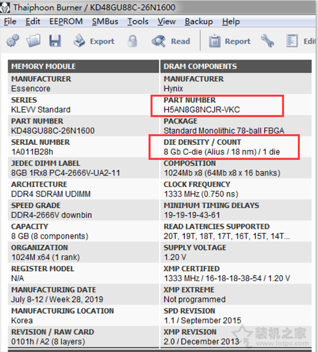 内存颗粒查询软件我们可以采用Thaiphoon Burner(台风)软件进行检测,可以检测到内存各个信息,最好更新到最高版本,软件检测不一定百分百准确哦。打开Thaiphoon Burner(台风)这款软件之后,我们点击“Read”读取内存查看PART MUMBER(颗粒编号),从颗粒信息中可以看出这根内存是CJR颗粒的。