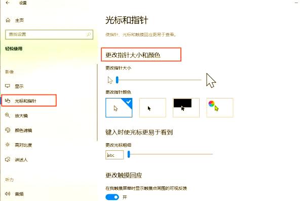 - 在左侧菜单中选择【光标和指针】,接着在右侧点击【更改指针大小和颜色】。