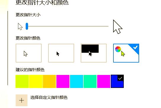 进入“更改指针大小和颜色”的设置区域,通过向上或向下滑动滑块,您可以依据个人喜好来调整鼠标指针的大小。如果您希望选择其他颜色,也可以在此进行更改。