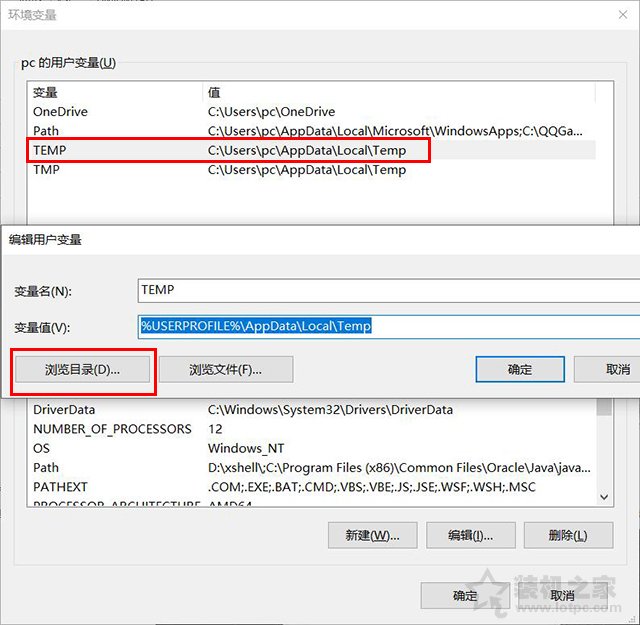 将TEMP和和TMP两个变量的路径修改为D盘、E盘、F盘等容量比较大的硬盘。双击“TEMP”变量,再点击“浏览目录”。