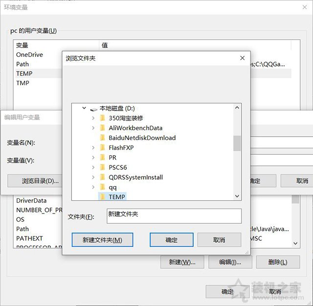 TMP设置方法相同,双击“TMP”变量,再点击“浏览目录”。在D盘中新建文件夹,命名为TMP,选中TMP文件夹,并点击确定,这时候可以看到TMP变量值为D盘了,点击确定完成设置。