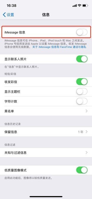 关掉iMessage信息:打开设置-信息,将iMessage信息关掉(尽管iMessage信息可以帮助我们发送免费信息,但是相信大家日常都是通过微信进行沟通,所以与其留着iMessage信息,倒不如关掉省事)。