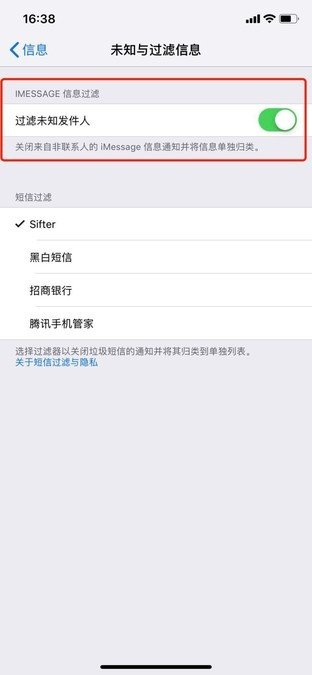 启用系统过滤:如果你非要使用iMessage信息的话,我们也可以启用iOS系统的过滤,设置-信息,打开未知与过滤信息,这样,当我们收到陌生人发送的信息时,iOS就会自动帮我们放到“过滤信息”分组中。