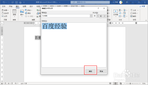 弹出“添加艺术字文字”设置字体和字号,点击“确定”。