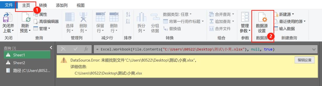 如下图,我们导入 Excel 文件之后,进入 PQ 编辑器中,可以看到外部的 Excel 文件是个绝对路径。