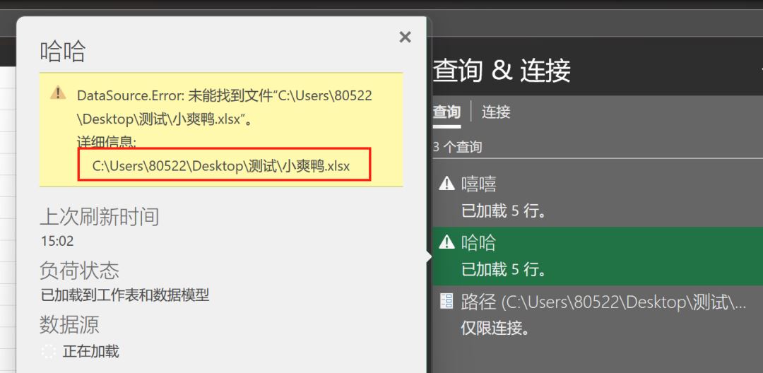 现在,我们来做一个测试,案例中我已经事先导入测试文件夹中小爽鸭的 Excel 文件,文件路径都引用了路径参数(此时数据源路径是存在的)。