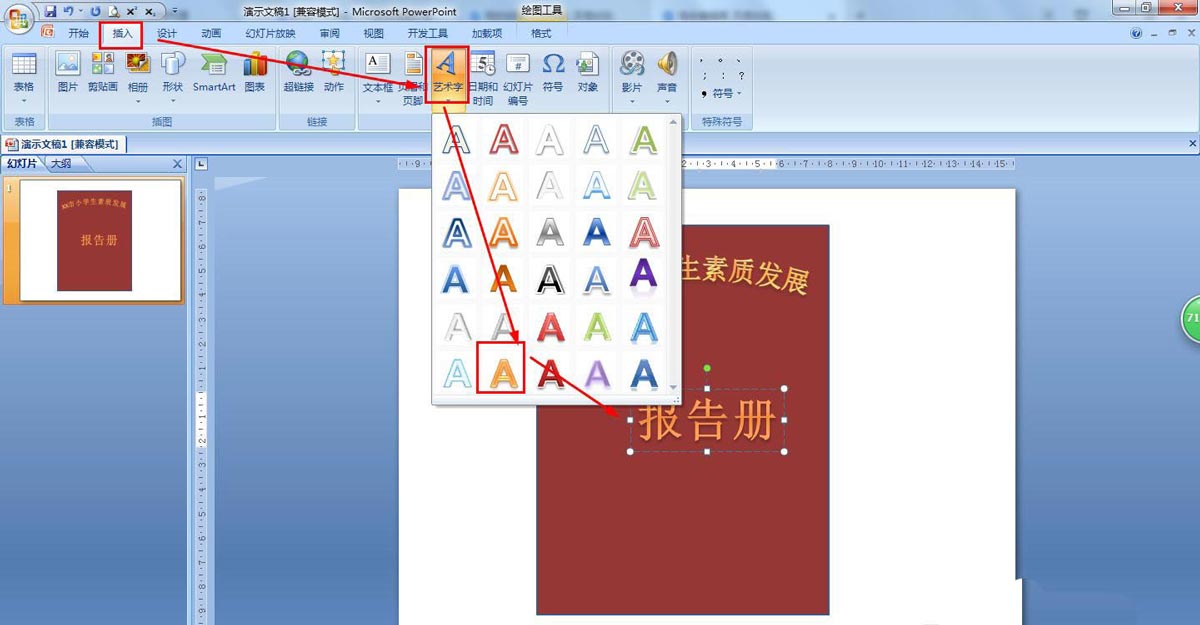 再点击插入——艺术字——选择:填充,强调文字颜色6——然后输入:报告册。