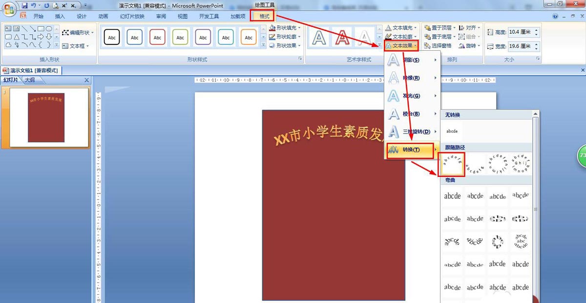 在开始菜单那里设置小一点的字体——点击格式——文本效果——转换——选择:上弯弧,然后再调整一上弧度。