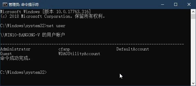 如果记不住要禁用的账户名,可通过命令来找到它。只需执行net user命令,在列表中查看账户即可。