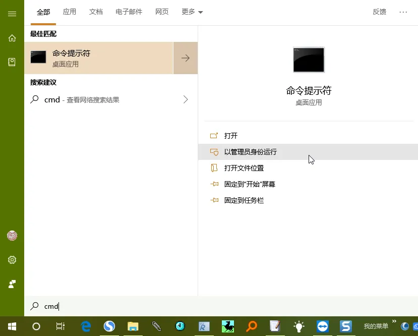 对于使用家庭版或专业版、企业版的Windows 10用户,均可用命令提示符的方法来实现。单击“开始”按钮并键入cmd,点击最佳匹配结果“命令提示符”,然后选择“以管理员身份运行”。