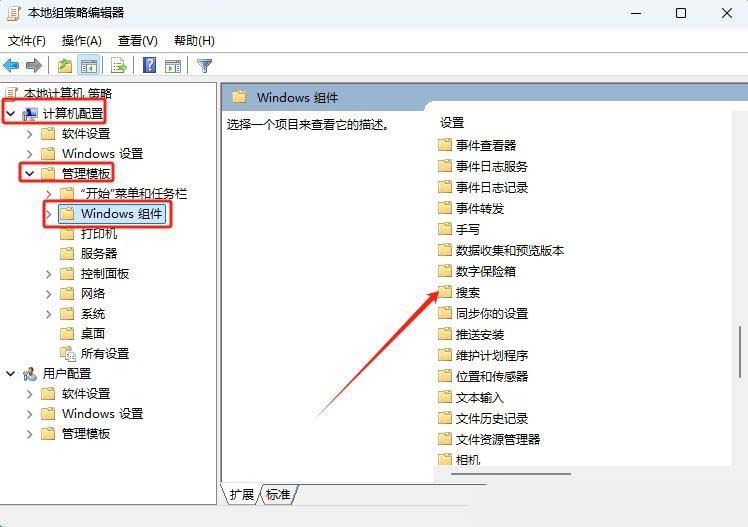 2、接着,在打开的界面中,依次点击展开“计算机配置管理模板Windows 组件搜索”。