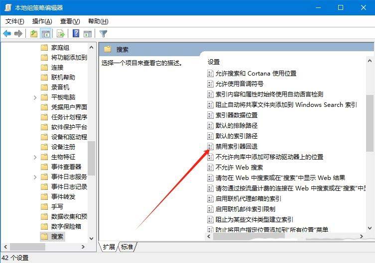 3、然后,再找到并双击打开其中的“禁用索引器回退”设置。