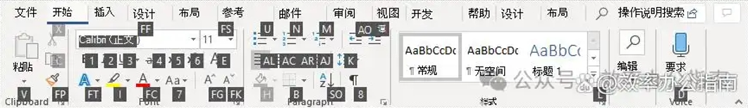 对于各种功能区选项,可以将“键提示”字母与 Alt 键组合在一起,以创建名为“访问键”的快捷方式。例如,按 Alt+H 打开“开始”选项卡,然后按 Alt+Q 移动到“操作说明搜索”或“搜索”字段。再次按 Alt,查看所选选项卡选项的“键提示”。