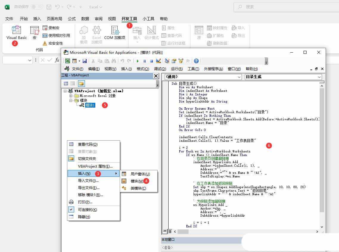 找到刚才创建的xlam文件,然后双击打开它,点击【开发工具】找到【visiual basic】,然后点击鼠标右键找到【插入】创建【模块】找到新建的模块,将刚才复制的代码直接粘贴到对应的位置,点击下保存