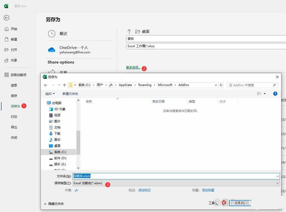 文件就会默认的保存在【C:\Users\yh\AppData\Roaming\Microsoft\AddIns】这个路径中