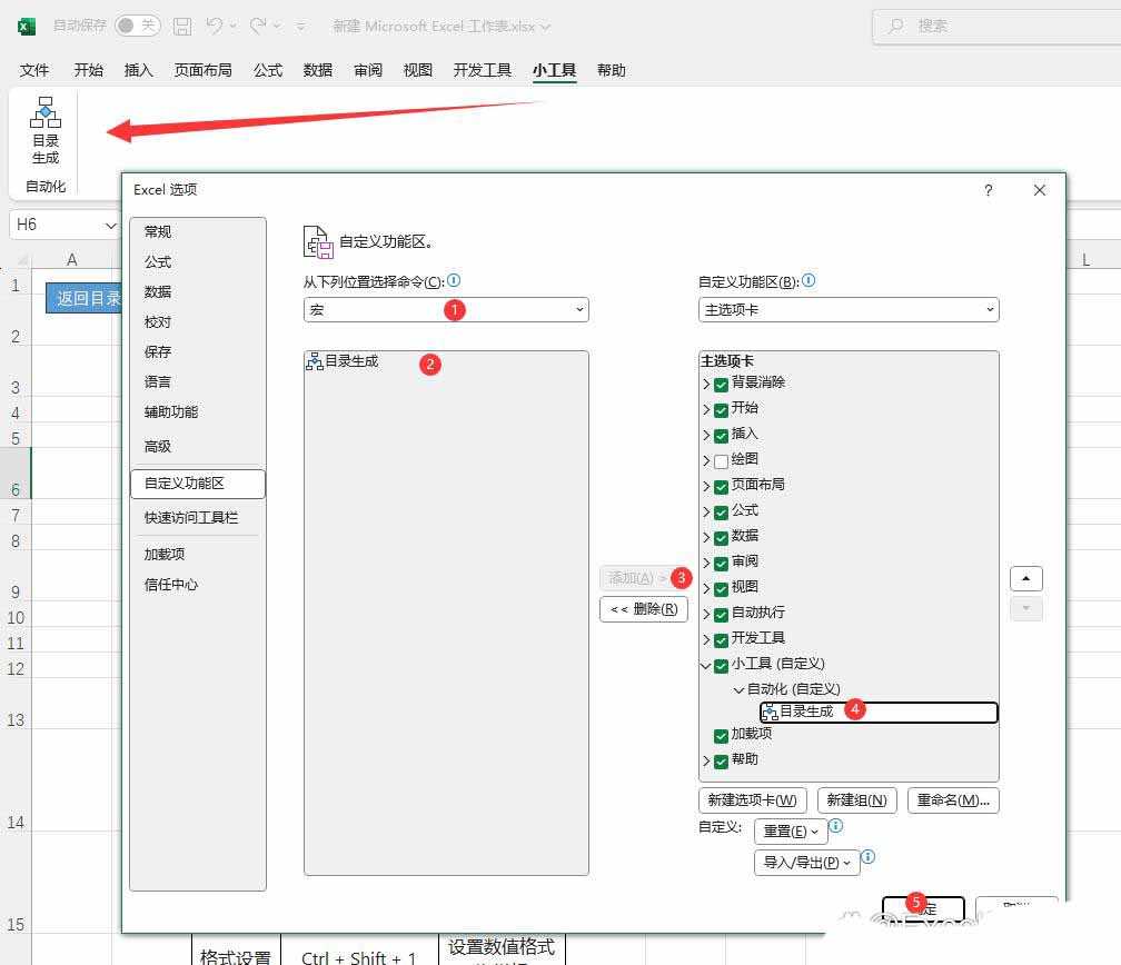 最后在左上角的区域中选择【宏】找到【目录生成】点击【添加】然后再点击【确定】