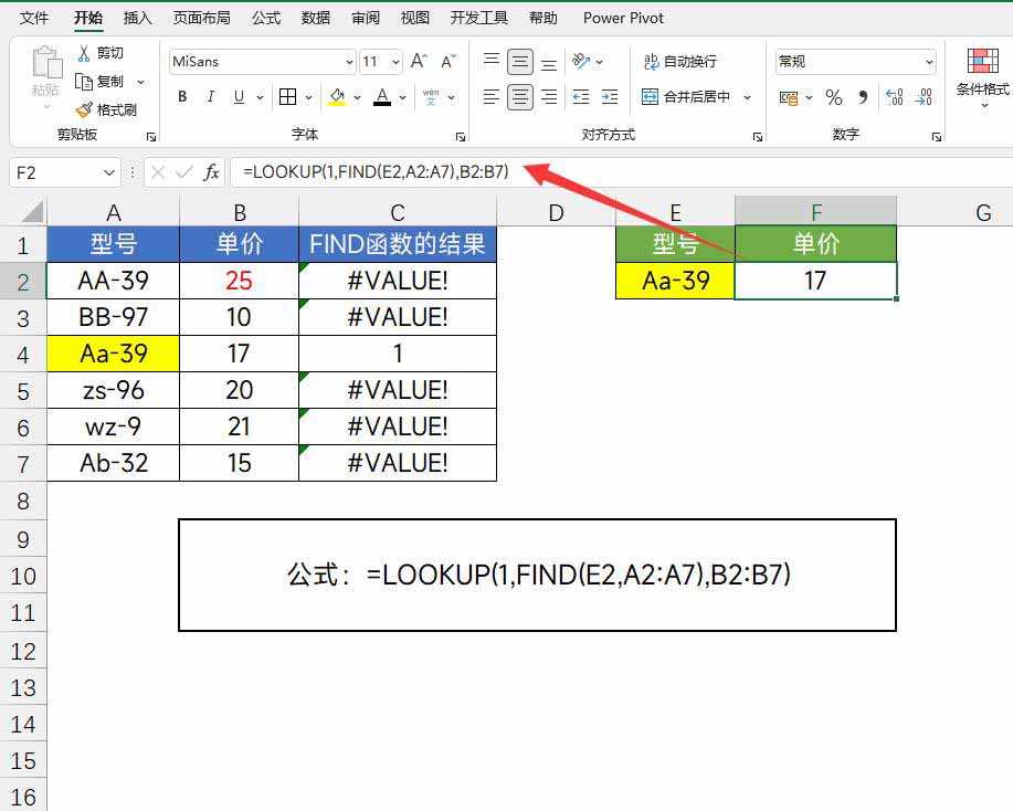 第一参数:1,查找值第二参数:FIND(E2,A2:A7),find函数构建的查找区域第三参数:B2:B7,返回结果的区域在这里FIND函数的结果如上图所示,找不到数据就会返回#VALUE!这个错误值,能找到数据就会返回1这个结果,这也是我们将LOOKUP函数设置为1的原因。这样的话就会根据1来返回对应的单元格,也正好是我们需要的结果