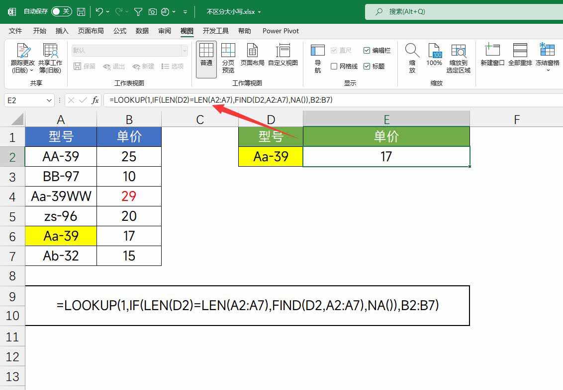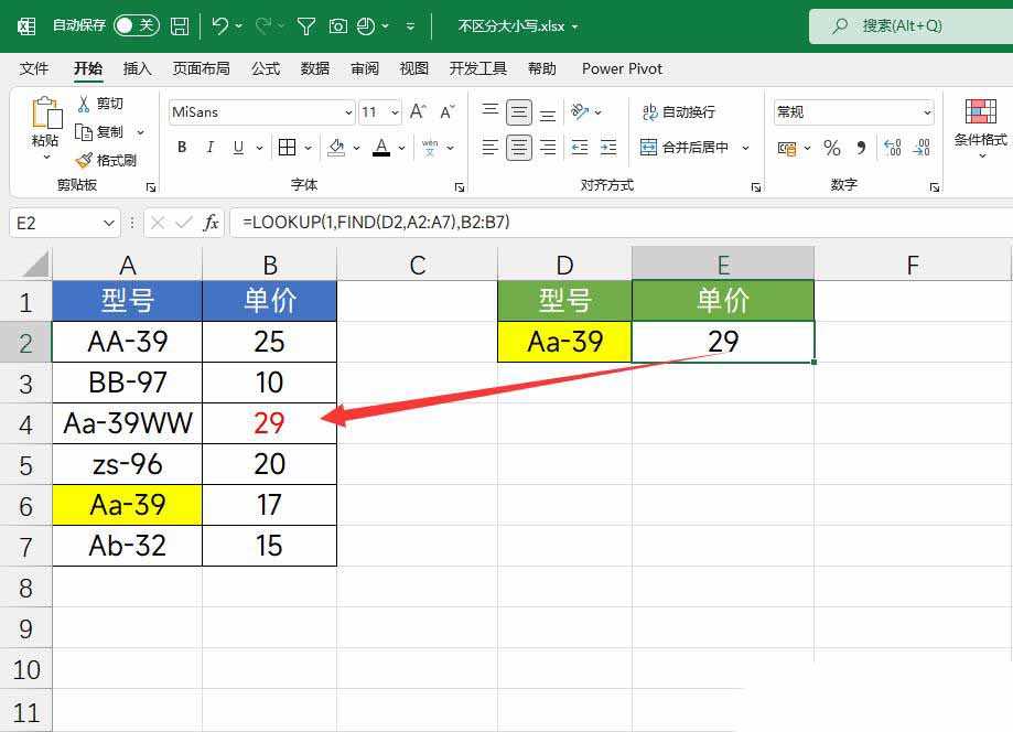 在这里更建议大家使用LOOKUP+FIND函数来解决查找函数不能识别大小写的问题,因为这个方法我觉得是比较简单的。只需要将函数设置为:=LOOKUP(1,FIND(E2,A2:A7),B2:B7)