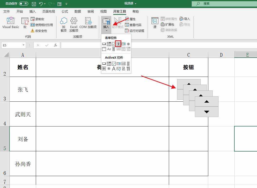 首先我们需要将表格的格式整理下,将宽度拉的宽一些,然后我们点击开发工具功能组找到插入然后选择数值调节按钮,画一个数值调节按钮,然后调整到合适的大小,我们将这个按钮复制三份,这样的话我们就得到了四个按钮
