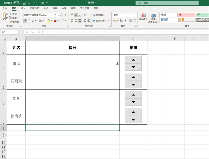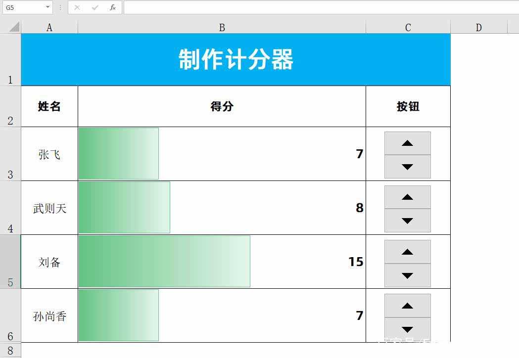 今天跟大家分享下我们如何使用excel制作一个计分器,如下图,当我们点击对应的向上的按钮数值就会增加1,点击向下的按钮数值就会减小1,这个的操作其实也不难,下面就让我们来一起操