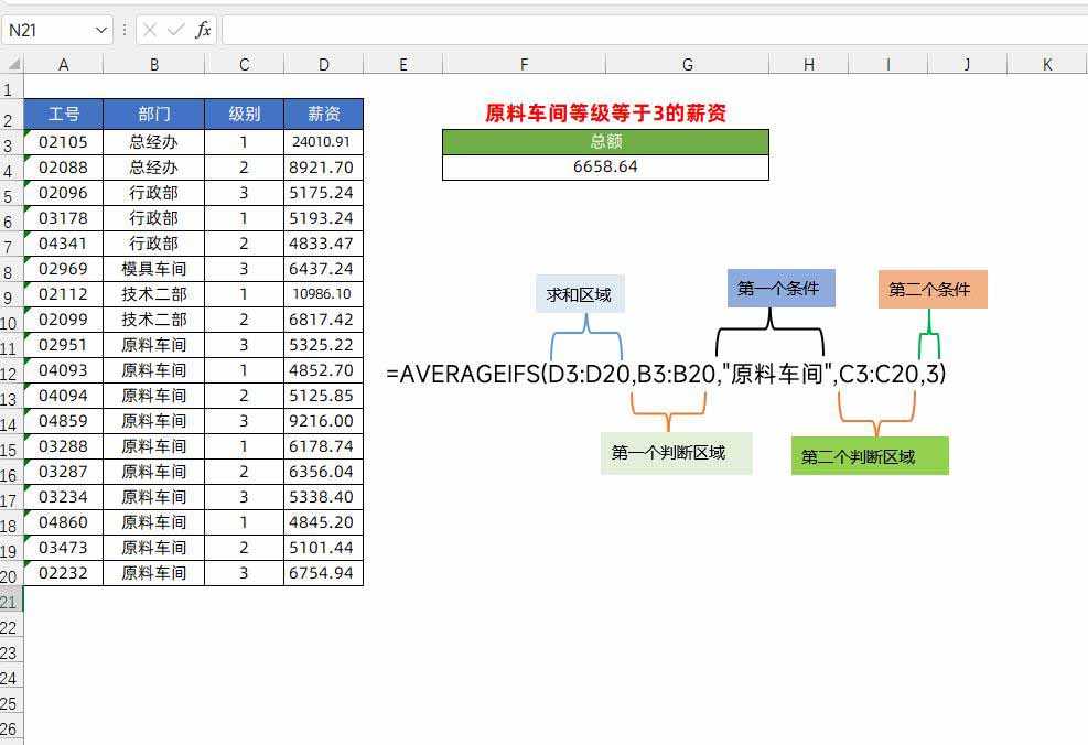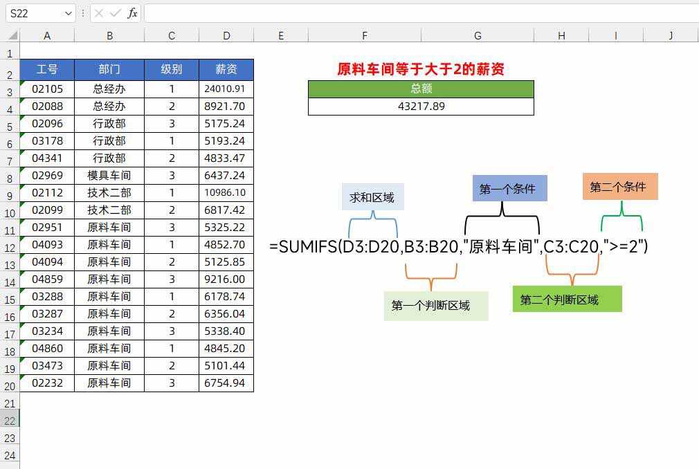 下图计算的是【原料车间且等级等于3级】的薪资之和