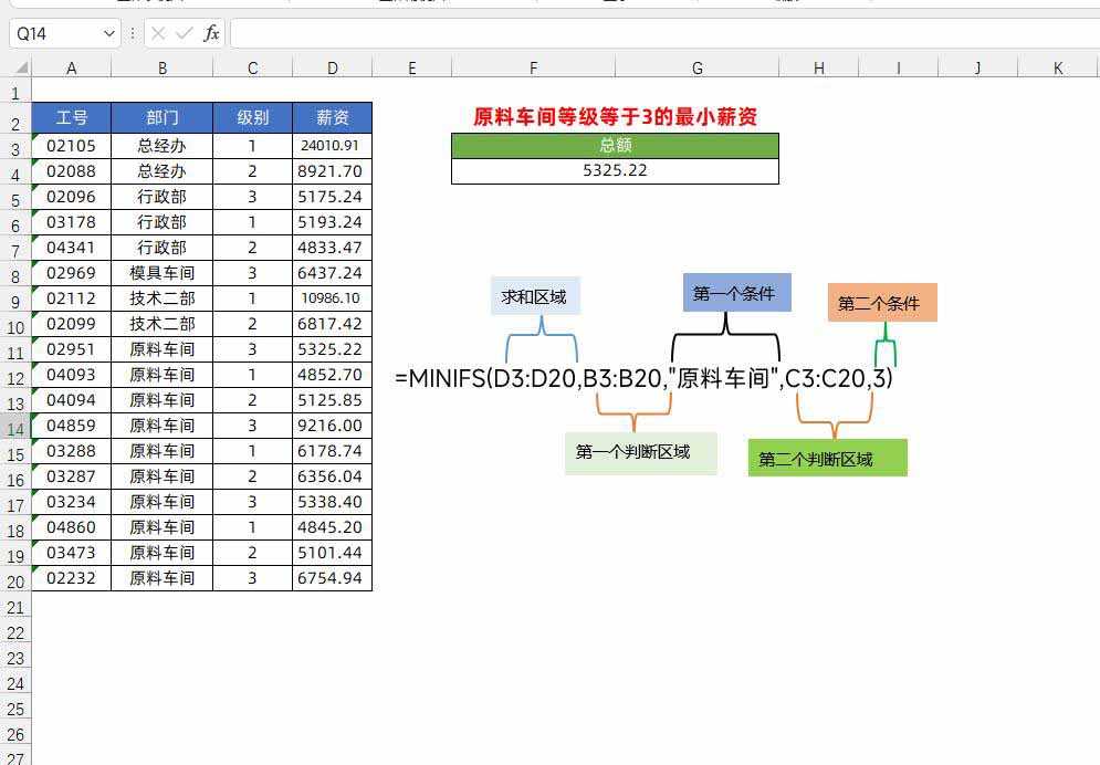 下图计算的是【原料车间且等级等于3级】的最小薪资