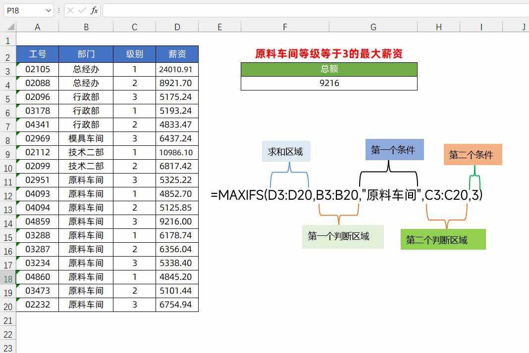 语法:=MAXIFS(求最大值区域, 第一个判断区域, 第一个条件, 第二个判断区域, 第二个条件,....)
