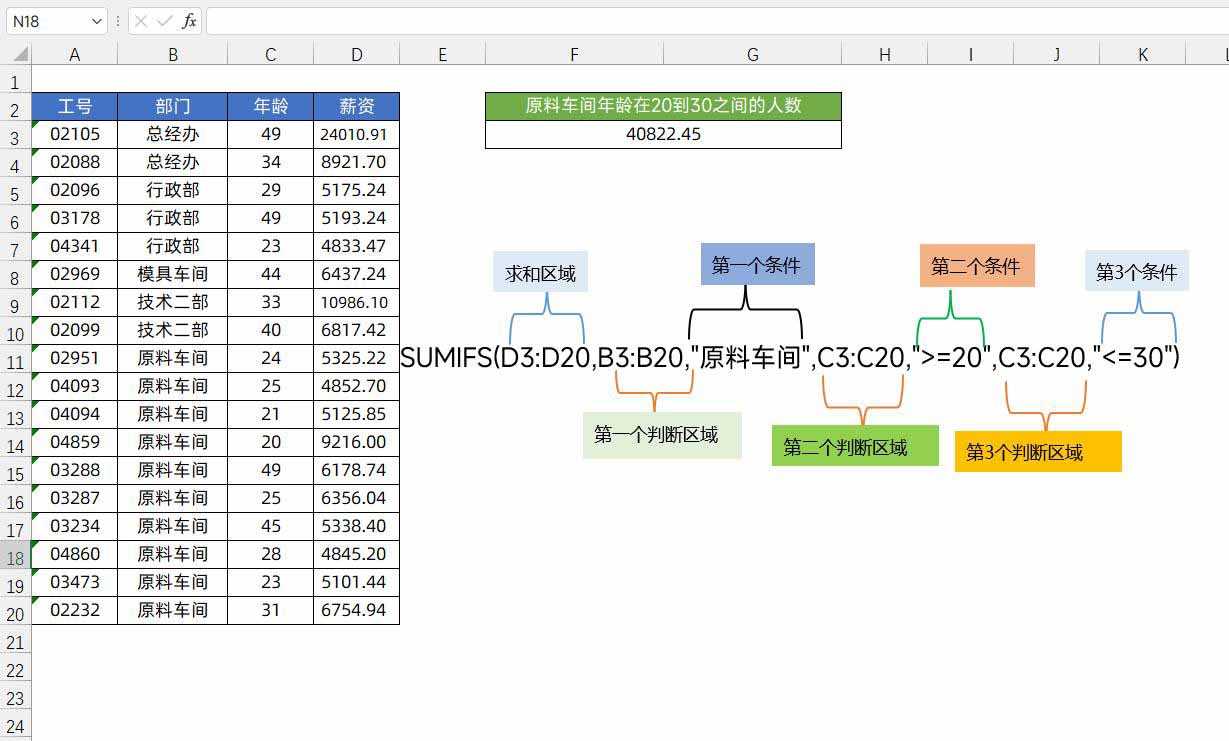 区间求和的原理与区间计数相似,我也是将1个区间拆分为2个条件计数,在这里我们想要计算下【原料车间】,【20-30】岁之前的薪资的总和,这个时候就需要SUMIFS来设置三组条件,具体的公式如下图所示