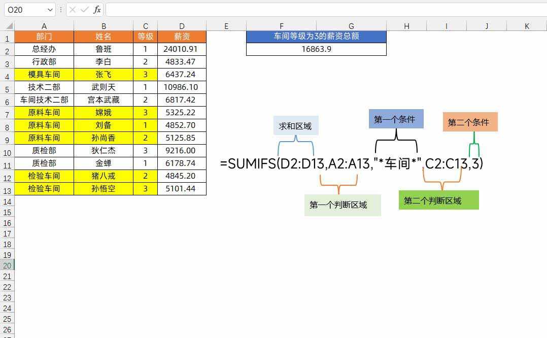 比如现在我们想要统计下3级员工车间总的薪资,就可以将条件设置为【*车间*】,然后在用SUMIFS进行条件契求和就好了