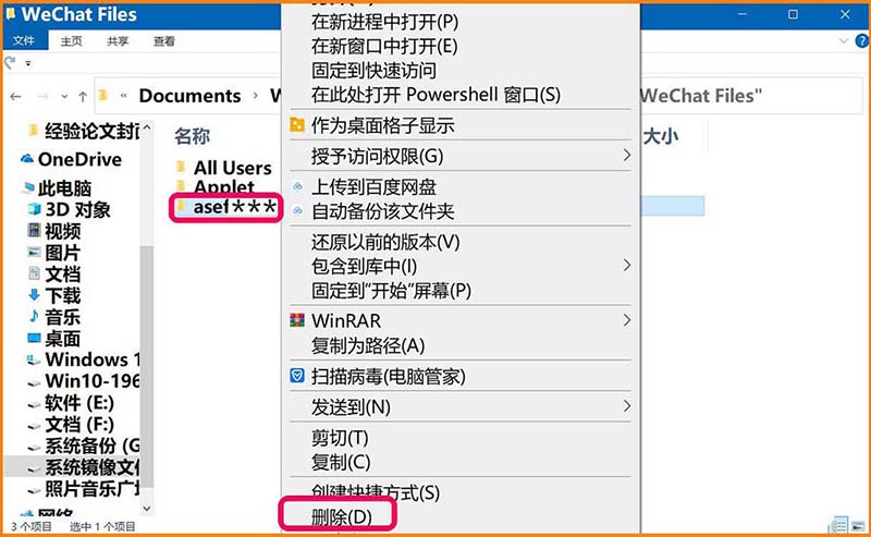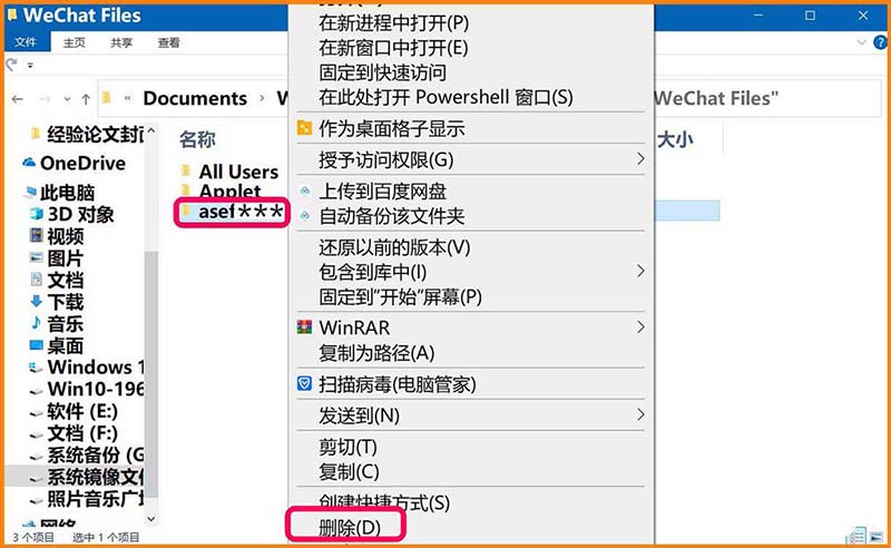 3、右键点击 asef**** 微信号文件夹,在右键菜单中点击:删除。