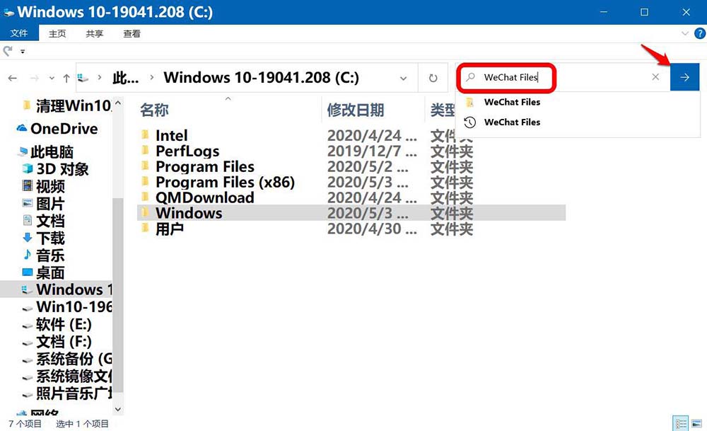 2、在搜索栏中输入 WeChat Files ,点击箭头或按下键盘上的回车键;