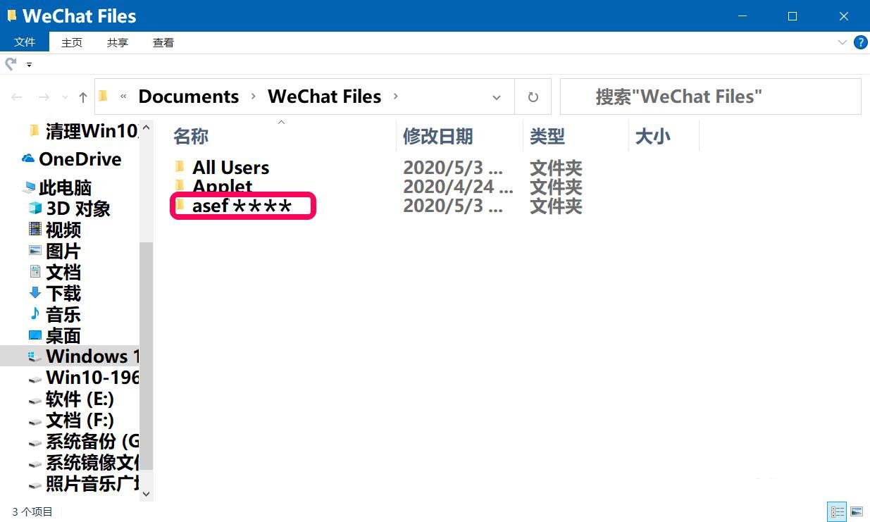 2、在打开的 WeChat Files 文件夹窗口中,我们可以看到登录使用过的微信号:asef**** ;