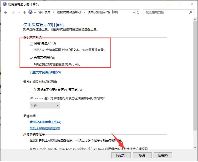 5、在聆听文本朗读的窗口下取消“启用讲述人”与“启用音频描述”的勾选,点击确定即可。(注意:如果你的桌面快捷图标有蓝框,那么“启用讲述人”和“启用音频描述”一定是勾选状态,所以去掉勾选点击应用--确定即可解决此问题。)