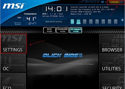 2、在uefi biOS设置界面,首先点击右上角的语言栏将其设置为中文,然后移动鼠标点击“SETTINGS”,如下图所示: