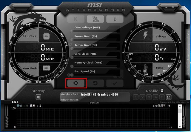 这时会弹出MSI Afterburner设定界面中,由于本人没有独立显卡,GPU1就是核心显卡。一般有独立显卡,GPU1是独立显卡,GPU2是核心显卡。