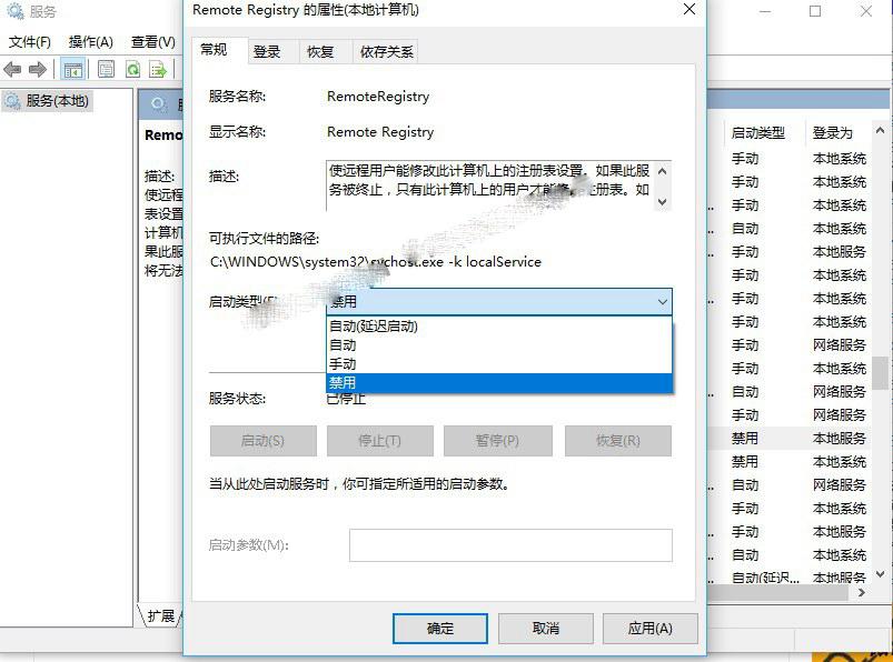 双击打开Remote Registry设置后,启动类型改成“禁用”,并点击底部的“确定”保存就可以了。